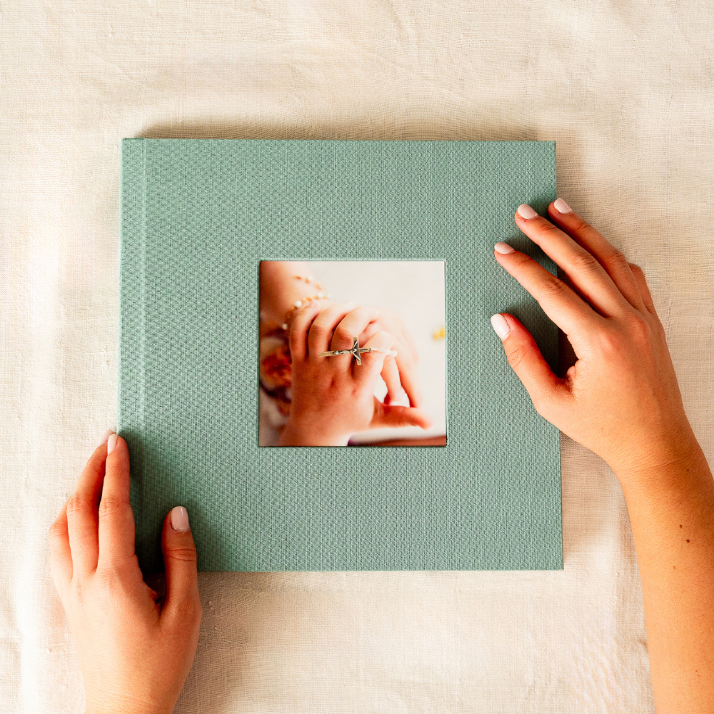 No modelo Cameo, a capa abre uma janela para a emoção. A tua fotografia favorita é integrada de forma permanente na capa em tecido, criando um leve relevo que a transforma no coração do álbum e num convite imediato para descobrir as memórias que guarda no interior.