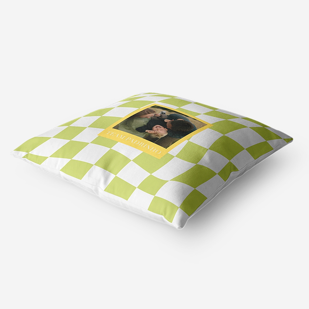 Dá um upgrade ao sofá com este padrão distorcido em verde azeitona. A moldura em amarelo faz a tua foto saltar à vista e transforma uma almofada simples numa peça com imensa pinta. Conforto e design moderno, sem complicações.
